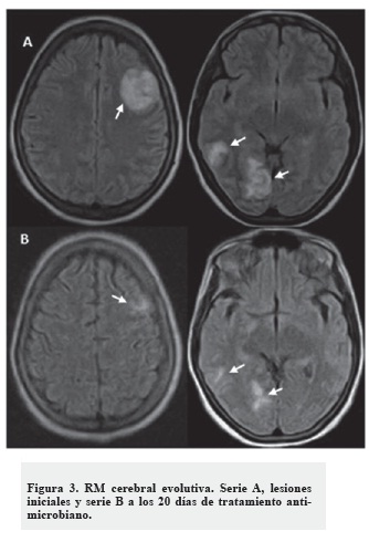 Decidimos realizar una SPECT cerebral con 99mTc - MIBI donde no se observó captación patológica del radiofármaco en el estudio precoz el ni tardío (Figuras 2, serie B y C). Ante la negatividad de este estudio, diagnosticamos que las lesiones evidenciadas en TC y RM de cráneo correspondían a abscesos cerebrales. La paciente fue tratada con antimicrobianos de amplio espectro y en estudio evolutivo a los 20 días -RM cerebral-, se observó una gran mejoría de las lesiones encefálicas (Figura 3).