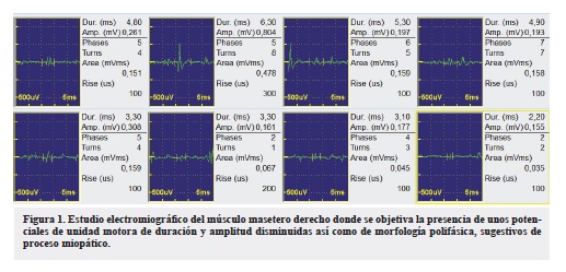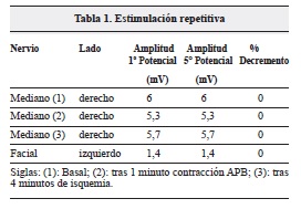 Todos los resultados fueron normales. Se llevó a cabo un estudio vídeo-endoscópico, se evidenció un trastorno de la deglución. Se realizó un completo estudio de conducción nerviosa en el que se valoró la conducción de ambos nervios medianos, cubitales, peroneales profundos, tibiales (con ondas F) y surales así como una estimulación repetitiva del nervio mediano derecho en condiciones basales, tras 1 minuto de contracción mantenida del músculo separador corto del pulgar derecho y tras 4 minutos de isquemia de la extremidad superior derecha. Se amplió el estudio realizando una estimulación repetitiva del nervio facial izquierdo ("Tabla 1). Por otro lado, se valoró la actividad electromiográfica de los músculos maseteros, deltoides, primeros interóseos dorsales, cuádriceps y gemelos internos de ambos lados. La paciente presentó una estatura de 1,65 metros y las mediciones se realizaron a una temperatura ambiental de 22ºC. El estudio neurofisiológico evidenció unos hallazgos en la conducción nerviosa y en la estimulación repetitiva normales, siendo patológicos los hallazgos electromiográficos (Tabla 2, Figura 1).