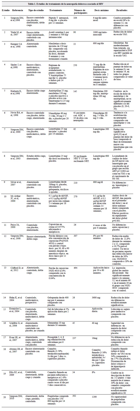 Se presenta una revisión de los estudios aleatorizados a doble ciego y controlados con placebo, publicados en la literatura científica sobre el tratamiento farmacológico y con terapias complementarias de la neuropatía periférica dolorosa, asociada al virus de la inmunodeficiencia humana adquirida (VIH), publicados entre enero de 1996 y octubre de 2015. Se localizaron 219 artículos y se seleccionaron para análisis 20 estudios.