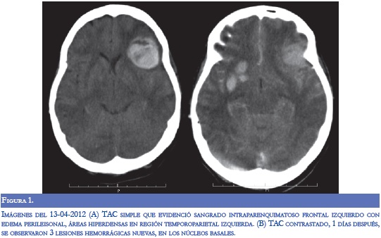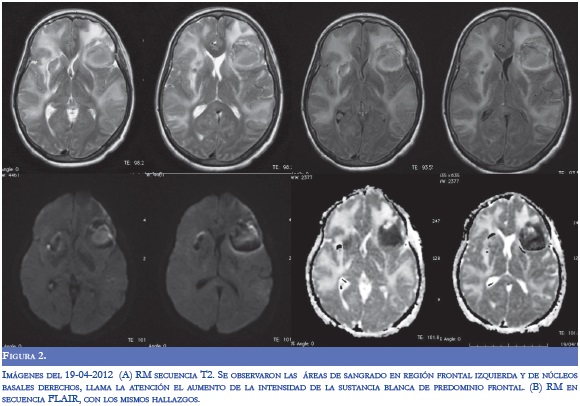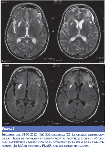 En la evaluación por neurología persistió disnéica con uso de musculatura intercostal, taquipnéica (FR: 32), taquicárdica (120) e inestabilidad hemodinámica (TA: 90/70), alerta con tendencia a la somnolencia, conteo vocal en 13, hipofonía, cuadriparesia 3/5 simétrica e hiporreflexia en 4 extremidades con respuesta plantar felxora bilateral. Se diagnosticó crisis miasténica, con inminencia de falla ventilatoria por lo cual se inició tratamiento con inmunolglobulina G humana y traslado a UCI. Durante la estancia hospitalaria, la paciente presentó respuesta inflamatoria sistémica, con aumento significativo de reactantes de fase aguda y enzimas hepáticas, secundario a bacteremia por Gram negativos, con requerimiento de soporte vasoactivo. Dos días después de finalizar manejo con inmunoglobulina, presentó focalización neurológica con mirada tónica hacia la izquierda, sin respuesta a estimulo externos, ni respuesta nociceptiva. Se realizó TC cerebral donde se evidenció sangrado en región frontal izquierda, otro en región cerebelosa derecha, ambos con edema perilesional, y disminución en la densidad en la sustancia blanca con aspecto de edema vasogénico (Figura 1). En la RM cerebral simple y contrastada se observaron lesiones hiperintensas subcorticales bilaterales con áreas de hemorragia (Figura 2). Se realizó panangiografia cerebral con vasoespasmo de la ACM izquierda M1 y ACA A1 derecha sin patrón de vasculitis. Durante su estancia hospitalaria presentó mejoría clínica y a las dos semanas se observó mejoría del edema vasogénico en las neuroimágenes (Figura 3).