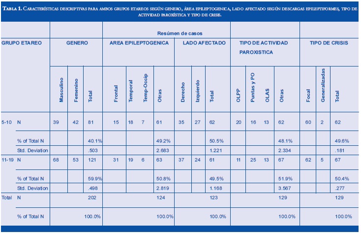 Se procesaron, tabularon y analizaron 202 casos de niños con registros electroencefalográficos del año 2011 en la Fundación Centro Colombiano de Epilepsia y Enfermedades Neurológicas -FIRE- Cartagena, Colombia. Análisis de frecuencias para estudios descriptivos para cada grupo, comparación de medias, tablas de contingencia y prueba de Chi- cuadrado.
