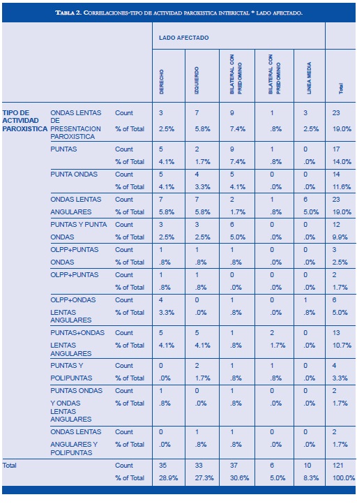 El tipo de actividad paroxística más frecuente fue (22.58 %) ondas lentas de presentación paroxística (OLPP), (21 %) ondas lentas angulares (OLA). El tipo de DEI encontrada fue focal en (96.7 %) y generalizada (3.23 %) en EEG interictal.