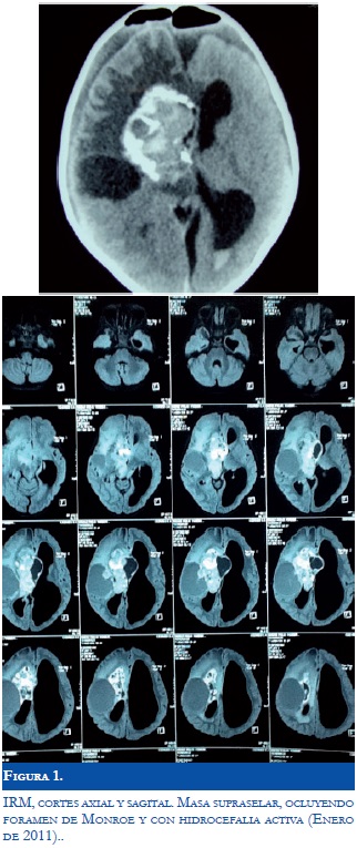 Paciente de 4 años, 10 meses quien es llevado a consulta externa por su madre por presentar limitación en la movilización del hemicuerpo izquierdo de comienzo súbito. No antecedentes de importancia. Al examen físico la única alteración evidente fue hemiparesia izquierda. Se plantea como hipótesis diagnostica inicial lesión supratentorial derecha por lo que deciden hospitalizar el paciente para realizar estudios complementarios. Realizan TAC cráneo, el cual reporta lesión intraxial compleja, de gran tamaño con componente quístico y sólido con calcificaciones, originado desde la cisterna supraselar con dilatación del sistema ventricular izquierdo. Ante estos hallazgos, deciden realizan resonancia magnética nuclear, en la cual describen lesión supraselar de 5 cms que afecta tálamo, quiasma óptico, cisterna supraselar, cisterna de la lámina terminalis y comprime foramen de Monroe, con gran porción solida calcificada y porción quística frontoparietal derecha (Figura 1). Con estos resultados, es evaluado por neurocirugía quien decide realizar resección quirúrgica total, la cual debe ser suspendida por sangrado abundante durante el procedimiento y por el gran tamaño de la lesión, colocan sistema de derivación ventrículo peritoneal y remiten al paciente a nuestra institucion para continuar manejo en unidad de cuidados intensivos Pediatricos, Neuropediatria y Oncología Pediatrica. El resultado de la patología de la lesión extraída reporta neoplasia compuesta por células grandes, estrechamente agrupadas con citoplasma poligonal similares a células ganglionares con núcleo grande, redondo vesicular, con nucléolo prominente y citoplasma eosinófilo. Hay otras células elongadas dispuestas en medio de una matriz fibrilar; el estroma en áreas es de aspecto fibroso y se observan vasos elongados con luces colapsadas. Hacia la periferia hay células multinucleadas y calcificaciones dispersas. Proteína fibrilar acida positiva en astrocitos dispersos. Sinaptofisina positiva en algunas células gigantes similares a células ganglionares. Cd34 positiva en la pared de los vasos. Ki-67 positivo en 1.2%. Se confirma la impresión diagnóstica previa de Astrocitoma Subependimario de Células Gigantes ( SEGA). Durante la evolución el paciente presenta convulsiones y en monitoreo video-EEG se confirma foco epileptiforme frontal derecho iniciándose manejo antiepiléptico con carbamazepina y posteriormente se adiciona topiramato. Se realizan exámenes complementarios (ecografía abdomen total, ecocardiograma y evaluación por oftalmología) en busca de otros criterios diagnósticos de Complejo de Esclerosis Tuberosa, pero no se encuentran otras alteraciones asociadas.