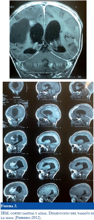 Ante la limitación para el manejo quirúrgico del Astrocitoma, se inicia manejo con Everolimus 2 mg/día. Durante la primera semana el paciente presenta mucositis oral, la cual mejora con manejo tópico. Dos semanas después el paciente permanece asintomático, por lo que se aumenta dosis de Everolimus a 2.5 mg/día. A los 4 meses de tratamiento, el paciente continua libre de crisis convulsivas, sin otros síntomas y sin efectos secundarios. El control de nivel sérico de Everolimus se encontró en 5 ng/ml. A los 8 meses presento convulsiones relacionadas con la suspensión del tratamiento antiepiléptico, que se controlaron fácilmente sin observarse deterioro clínico. En el control 1 año después del inicio del tratamiento (Figura 2), el niño continua sin presentar convulsiones y con mejoría de la movilidad del hemicuerpo izquierdo. En ese momento el paciente se encuentra escolarizado con adecuado aprendizaje y calidad de vida. En el último control, por aumento de peso y superficie corporal, se ajusta dosis de medicación a 5 mg/día y posteriormente, los niveles séricos se encuentran en 6.5 ng/ml.