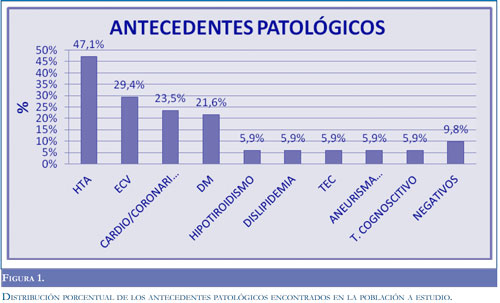 El 47.1% de los pacientes tuvieron antecedente de hipertensión arterial y en el 29,4% hubo historia de uno o varios ECV previos, el 23,5% presentaron algún tipo de cardiopatía o coronariopatía, el 21,6%, fueron diabéticos y el 5,9% hipotiroideos, dislipidémi-cos, o con deterioro cognoscitivo comprobado e igual porcentaje con trauma craneoencefálico (Figura 1).