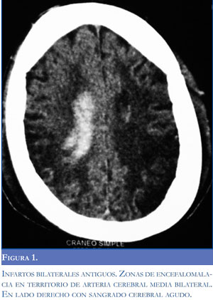 Presentación de caso. Paciente de raza negra, natural y procedente de San Pedro de los Milagros, Antioquia, con antecedente de enfermedad de células falciformes detectada a los 12 años cuando presentó déficit motor del hemicuerpo derecho, demostrándose en imágenes un ataque isquémico en territorio de la arteria cerebral media izquierda. Desde ese momento la paciente quedó con secuelas motoras. Hacia los 15 años presentó déficit en hemicuerpo izquierdo secundarios a un segundo ataque cerebro-vascular de arteria cerebral media derecha (Figura 1). Desde este momento se inició tratamiento con acido acetil salicílico, y en su evolución requirió múltiples hospitalizaciones y transfusiones.