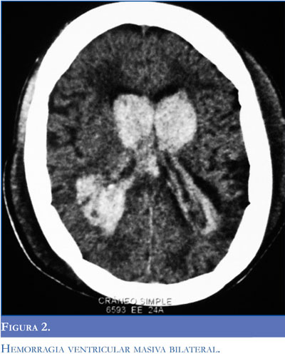Se realizó ventriculostomía externa con drenaje parcial de la hemorragia ventricular. La presión arterial se continuo modulando con antihiperten-sivos orales.