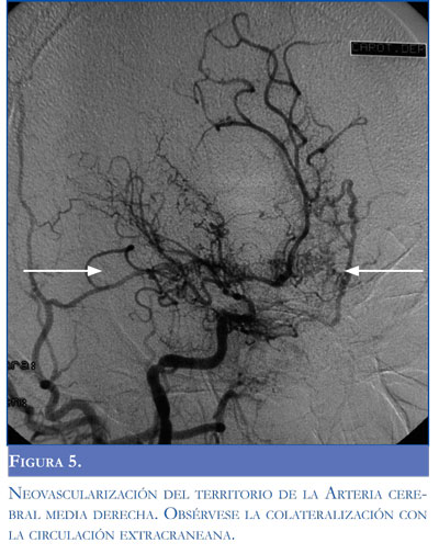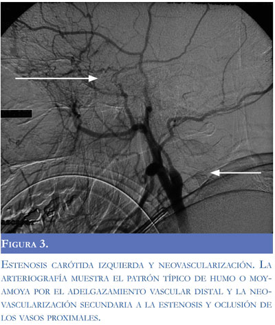 El termino moyamoya fue introducido por Suzuki y Takaku en 1957 por el aspecto angiográ-fico de la circulación colateral cerebral en humo de cigarrillo o fumarola (en japonés "moyamoya"). En esta entidad existe una esteno-oclusión de múltiples vasos intracraneales con aparición de colaterales del polígono de Willis, leptomeningeas o con formación de aneurismas u otras malformaciones arteriovenosas. Cuando existen colaterales entre circulación anterior y posterior o entre la circulación intracraneana y la extracraneana existe mayor riesgo de hemorragia intracraneana. En la enfermedad de moyamoya existe predisposición genética, en cambio, en aquellos pacientes sin la enfermedad pero con el patrón angiográfico típico existe una enfermedad de base (síndrome de moyamoya) que los predispone a desarrollar el daño vascular, como la ateroesclero-sis en ancianos, la neurofibromatosis, la esclerosis tuberosa, la tuberculosis, el síndrome de Down y la enfermedad de células falciformes (5-6). Dobson describió 44 pacientes con enfermedad de células falciformes y demostró que aquellos con síndrome o patrón angiográfico de moyamoya tuvieron más riesgo de eventos cerebrovasculares recurrentes (7).
