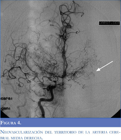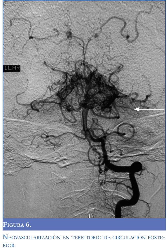 Una arteriografía realizada durante la primera semana de evolución mostró estenosis de la carótida izquierda con adelgazamiento distal de la vascula-tura cerebral con neoformación y colateralización de circulación externa con la interna conformando un patrón típico de síndrome moyamoya (Figuras 3, 4, 5 y 6). El control imagenológico hacia los 15 días de hospitalización evidenció una disminución del 50% en el volumen del sangrado intraventricular. La paciente logró llegar a un alertamiento espontáneo sin contenido de la conciencia ni respuesta al llamado. A los 45 días de evolución logra salir de UCIN con traqueostomía percutánea y nutrición por gastrostomía.