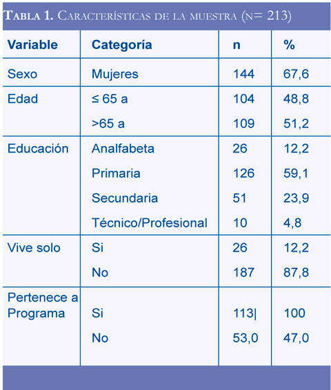 Se entrevistaron 213 personas residentes en el área urbana de Manizales, con rango de edad entre 50 y 91 años (promedio de edad 65,7 ± 12 años) y una distribución similar entre menores y mayores de 65 años (48,8% y 51,2%, respectivamente). Las mujeres representaron el 67,6% de la muestra, ocupación "hogar" fue mencionada por el 55,9%, seguida de "pensionado" por el 14,5%. La condición social de "vivir solo" se reportó en 12,2% y casi la totalidad de los encuestados pertenecían a estratos socioeconómicos bajo y medio, con un nivel educativo predominante de estudios primarios en 59,0% y un analfabetismo de 12,0%. En cuanto a la característica de pertenecer a programa especial de HTA o DM, el 53,0% de los encuestados pertenecía a ellos. En la tabla 1 se consignan datos de la muestra.