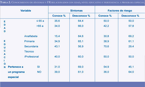 Se consideró conocimiento espontáneo bueno si el sujeto era capaz de citar dos o más síntomas correctos, conocimiento regular si solo citaba uno y malo si no citaba algún síntoma correcto. Esta misma calificación se utilizó para estimar el conocimiento espontáneo de los factores de riesgo.