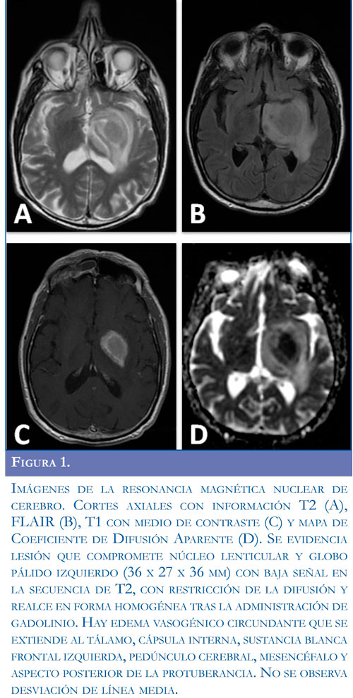 Imágenes de la resonancia magnética nuclear de cerebro. Cortes axiales con información T2 (A), FLAIR (B), T1 con medio de contraste (C) y mapa de Coeficiente de Difusión Aparente (D). Se evidencia lesión que compromete núcleo lenticular y globo pálido izquierdo (36 x 27 x 36 mm) con baja señal en la secuencia de T2, con restricción de la difusión y realce en forma homogénea tras la administración de gadolinio. Hay edema vasogénico circundante que se extiende al tálamo, cápsula interna, sustancia blanca frontal izquierda, pedúnculo cerebral, mesencéfalo y aspecto posterior de la protuberancia. No se observa desviación de línea media.