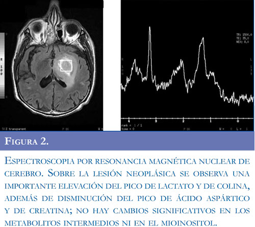 Espectroscopia por resonancia magnética nuclear de cerebro. Sobre la lesión neoplásica se observa una importante elevación del pico de lactato y de colina, además de disminución del pico de ácido aspártico y de creatina; no hay cambios significativos en los metabolitos intermedios ni en el mioinositol.