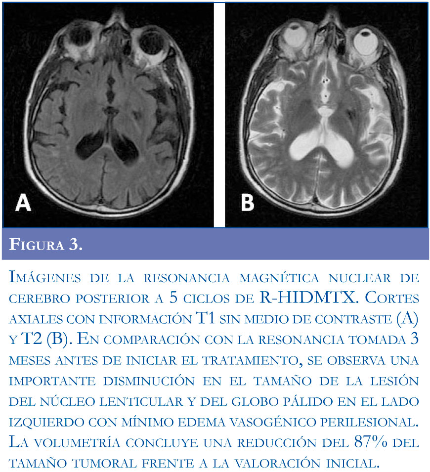 Once días después del ingreso y diez días tras la RIS, se decidió iniciar el esquema de quimioterapia (R+HIDMTX) con rituximab 375mg/m2 y meto-trexate (MTX) 2.5g/m2 el día 1 y dexametasona 40mg entre los días 1 y 4. El procedimiento se llevó a cabo con alcalinización de la orina y vigilancia de la función renal, siguiendo un esquema de aplicación quincenal. Los ciclos subsiguientes contemplaron el aumento progresivo de la dosis de rituximab a 1000mg y 1500mg. Durante el último control efectuado el 14 de Julio de 2011 se encontró en la resonancia contrastada posterior a cinco ciclos de quimioterapia, una disminución significativa del volumen de la lesión expansiva localizada en los núcleos grises (Figura 3); la volumetría pre y postratamiento mostró una disminución del 87% desde 10.8cm3 a 1.4cm3, confirmando una muy buena respuesta parcial. La sintomatología neurológica mejoró: actualmente el paciente se encuentra sin anormalidades en el examen mental aunque persiste con leve debilidad para caminar por lo que requiere apoyo, y está en seguimiento de su recuperación clínica por el servicio de neurología. Previo a la aplicación del sexto ciclo se registró un aumento de los niveles séricos de creatinina (hasta 1.5mg/dL), motivo por el cual se cambió el MTX por citarabina a altas dosis, revalorando el paciente al final del tratamiento y alcanzando respuesta casi completa tras 2 ciclos de quimioterapia sin toxicidad asociada.