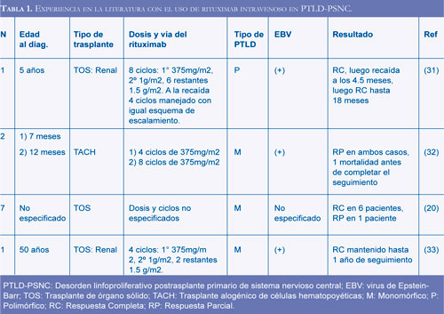La experiencia respecto al uso de anticuerpos monoclonales administrados por vía intravenosa es muy limitada, encontrándose en estudios preclínicos una biodisponibilidad intratecal del 0.1% al usar la vía intravenosa (29). Sin embargo, se ha sugerido la posibilidad de encontrar una disrupción local de la BHE en los sitios comprometidos por el fenómeno linfoproliferativo, motivo por el cual se podrían obtener mayores concentraciones de los agentes terapéuticos sobre el lecho tumoral (30). Cuatro reportes que incluyeron 11 pacientes con diagnóstico de PTLD-PSNC y recibieron rituximab (Anticuerpo monoclonal anti CD20) a dosis estándar o elevadas (mayores de 375mg/m2/semana por 4 semanas o más) por vía intravenosa sustentan esta hipótesis (Tabla 1). Aún se requieren estudios prospectivos que permitan evaluar la eficacia y seguridad de esta estrategia terapéutica en mayor profundidad y a largo plazo.