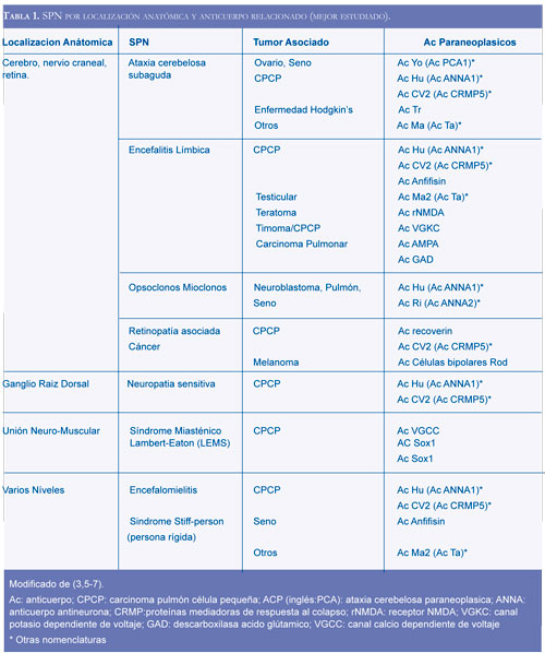 Un SPN definido puede ser la expresión clínica de diferentes tumores (Tabla 1). Se presentan algunos ejemplos: el síndrome tipo ataxia cerebelosa relacionado con cáncer de seno, ovario o linfoma de Hodking (1); la encefalitis límbica asociada con cáncer de pulmón de célula pequeña, testículo, seno, timoma y el teratoma de ovario (5,6).