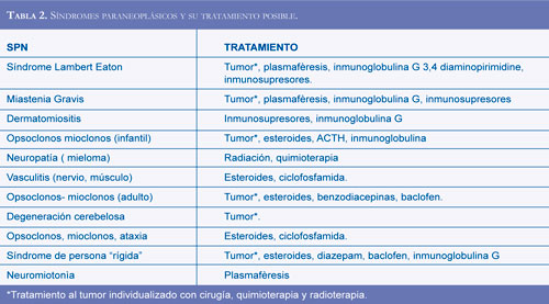 El tratamiento de los SPN ha avanzado poco por la baja frecuencia de presentación y la carencia de modelos animales (8). El abordaje se hace a través de dos objetivos (8, 15): la resección y esquemas adicionales de tratamiento al tumor que produce el SPN (cirugía, quimioterapia, radioterapia) y modificando la respuesta inmune con terapia inmunomoduladora. Se usan medicamentos como esteroides, ciclofos-famida, anticuerpos monoclonales, plasmaféresis, inmunoglobulina intravenosa, tacrolimus y otras sustancias.