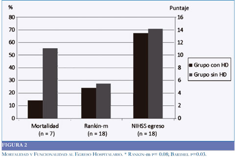 La afasia se presentó en el 42.8% de los sobrevivientes del grupo de HD y en el 63.6% del grupo a quienes no se les realizó HD, (p=0,152). En el grupo con HD se observó una mejor funcionalidad y menor discapacidad al egreso, p= 0,08 para el Rankin-m y p= 0,03 para el Barthel (Figura 3).