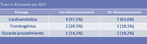 Ninguno de los pacientes tenía ACV previo y los antecedentes relacionados como factores de riesgo cardiovascular fueron similares en los dos grupos excepto por la fibrilación auricular, presente en 6 de los 7 pacientes a quienes se les realizó HD (Tabla 2). El origen cardioembólicofue similar entre los dos grupos (57,1% en el grupo de HD frente a 63% en los pacientes sin HD, p=0,27); la etiología aterotrombótica se identificó en 2 pacientes (28,5%) en el grupo con HD, y en 2 (18,1%) en el grupo sin HD.Tres pacientes presentaron el ACV durante procedimientos de hemodinamia, dos de los cuales en el grupo sin HD (18,1%) (Tabla 3).