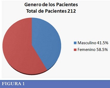 Entre el total de pacientes, 88 pacientes fueron de género masculino y 124 mujeres (Figura 1).