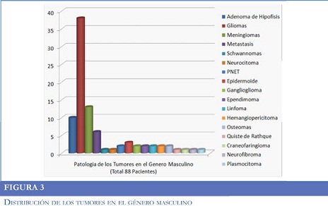 Los tumores cerebrales afectan más comúnmente al género masculino que al femenino. Se ha demostrado que los gliomas se presentan en hombres un 40% más que en mujeres (11). Esta serie mostró que los gliomas representaron 46.5% de las lesiones en el género femenino. Los tumores de hipófisis y los tumores neurales como los neurofibromas y los schwannomas afectan igualmente a ambos géneros (12).