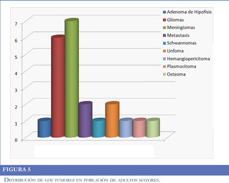 En los 11 pacientes pediátricos se encontraron 3 meduloblastomas y 3 gliomas (Figura 4). Mientras que en los adultos mayores de 65 años se encontró que los meningiomas fueron las lesiones mas frecuentes, presentándose en el 31.81% de los casos, seguidos por los gliomas en el 27.27% de los pacientes. Las metástasis se encontraron en solo el 9% de los casos de adultos mayores (Figura 5).