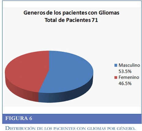 En los pacientes con gliomas, la edad promedio fue de 43.88 años. Treinta y ocho pacientes fueron hombres y 33 pacientes mujeres (Figura 6).