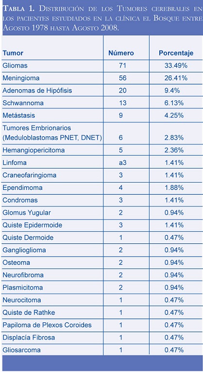 Materials and Methods. We reviewed the pathological studies of those patients with tumors of the central nervous system who were done in the Clinica el Bosque between August 1, 1978 and August 31, 2008.