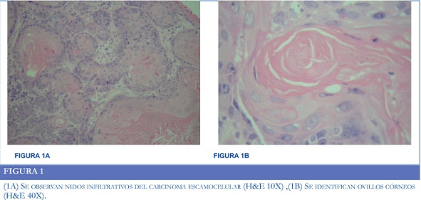 La lesión fue diagnosticada como un carcinoma de células escamosas grandes, bien diferenciado, queratinizante e infiltrante.