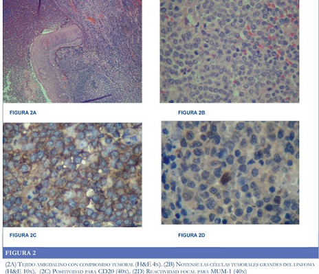 La lesión amigdalina mostró un tumor maligno (Figura 2) caracterizado por una proliferación difusa de células hematolinfoides grandes (Figura 2A) con núcleos ligeramente hendidos, cromatina densa y numerosas mitosis (Figura 2B). El estudio de inmunohistoquímica fue positivo para CD20 (Figura 2C), BCL-2 y MUM1 (Figura 2D) con negatividad para CD10, BCL-6, Ciclina D1 y P53. Los linfocitos T acompañantes fueron positivos para CD3 y CD5. El Ki67 fue del 80%. La lesión fue clasificada como linfoma No Hodgkin B difuso de célula grande de fenotipo no centro germinal.