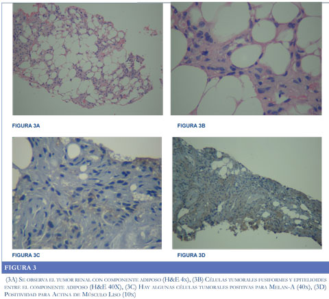 La biopsias de la masa renal (Figura 3) mostraron fragmentos de riñón y tejido adiposo (Figura 3A), infiltrados por células eosinófilas, epiteliodes (Figura 3B) y fusiformes las cuales expresaron Melan-A de forma débil (Figura 3C) y positividad para Actina de músculo liso (Figura 3D) y CD68. La proteína S100 fue negativa así como el antígeno del carcinoma de células renales (RCC), antígeno epitelial de membrana (EMA), CD117, citoqueratinas, citoqueratina 7 (CK7), CD15 y CD10. Se descarto la posibilidad de un oncocitoma renal y de un carcinoma de células claras o cromófobo, clasificándose la lesión como un angiomiolipoma renal.