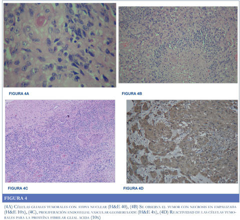 El material de la resección cerebral mostró un tumor maligno de alto grado (Figura 4) caracterizado por una proliferación de células de aspecto glial con atipia nuclear (Figura 4A) e incremento de la actividad mitótica acompañado de necrosis con patrón de empalizada (Figura 4B) y proliferación endotelial vascular glomeruloide (Figura 4C). Las células tumorales fueron positivas para Proteína Glial Fibrilar Acida (Figura 4D) Se descartó en el diagnóstico diferencial lesión metástasica incluyendo carcinoma (Citoqueratinas negativas). Se categorizó la lesión como un glioblastoma multiforme.