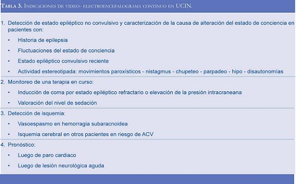 El VEEGc es un examen no invasivo que ayuda a evaluar la función cerebral y hace parte del monitoreo multimodal en las unidades de cuidados intensivos; razón por la cual se ha expandido su uso, que cada vez tiene más indicaciones (Tabla 3) (12-14).