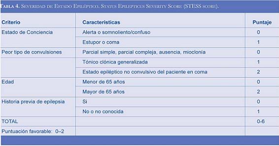 Para el tratamiento del EER, la literatura ofrece dos alternativas: una es la inducción de coma, hasta alcanzar un patrón estallido-supresión en el VEEGc, la otra es realizar un manejo menos agresivo, usando solo altas dosis de anticonvulsivantes. Se ha debatido cuál de los tratamientos escoger y a cuál paciente llevar a sedación profunda (15-22). En publicaciones recientes, se propuso el puntaje STESS (Status Epilepticus Severity Score) (Tabla 4), para estratificar a los pacientes de acuerdo a la severidad del EE y con esto tratar de seleccionar el tratamiento más adecuada para cada paciente (34). En general en el INDEA, se utiliza manejo no agresivo en los pacientes con puntajes bajos, y sedación profunda en los pacientes con alta puntuación (mayor de 2) (Figura 2).