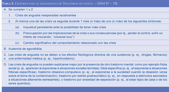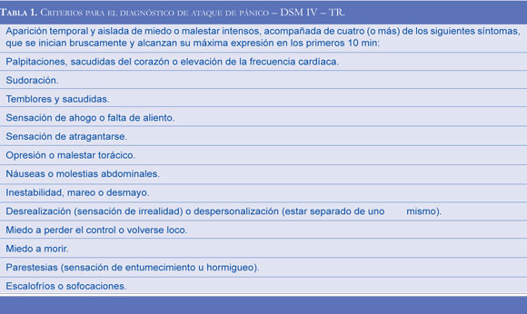 Por otro lado, las crisis de angustia pueden ser también la expresión de un ataque de pánico, según describe el DSM IV - TR. Este se define como la aparición temporal y aislada de miedo o malestar intenso de inicio súbito, alcanzando su máxima expresión durante los primeros 10 minutos, en el que se evidencian algunas de las siguientes expresiones somáticas: palpitaciones, sudoración, ahogo, opresión torácica, náusea, vómito, escalofrío, sofocaciones, parestesias (sensación de entumecimiento u hormigueo), además de un profundo miedo a morir o a perder el control. Esta clínica se puede presentar como una manifestación de varios trastornos de ansiedad, entre ellos: trastorno de pánico con o sin agorafobia, trastorno obsesivo compulsivo, fobia social, entre otros. Sin embargo, los ataques de pánico no necesariamente configuran un diagnóstico de trastorno de pánico primario, para realizar el diagnóstico formal se requiere que haya crisis inesperadas, recidivantes y que al menos una de las crisis esté seguida durante un mes (o más), de uno (o más) de los siguientes síntomas: inquietud persistente ante la posibilidad de tener más crisis, preocupación por las implicaciones de las crisis o sus consecuencias y cambios significativos del comportamiento relacionados con las crisis, éstas no deben ser secundarias al efecto fisiológico directo de una sustancia o una enfermedad médica y no puede explicarse por otro trastorno mental (5,6) (Tablas 1 y 2). El ataque de pánico posee una tasa de prevalencia del 3 a 5.6%, y el trastorno de pánico entre el 1.4 a 2.9%; este último es más frecuente en mujeres, la edad media de aparición es a los 25 años, aunque puede aparecer en cualquier momento de la vida. Generalmente está asociado a trastorno depresivo mayor (10-15%), a otros trastornos de ansiedad, hipocondría, trastornos de la personalidad y a consumo de sustancias (7). Desde el punto de vista anatomopatólogico, el hipocampo y la amígdala se han involucrado en esta entidad se ha confirmado la participación de los neurotransmisores, noradrenalina, serotonina y GABA (8).