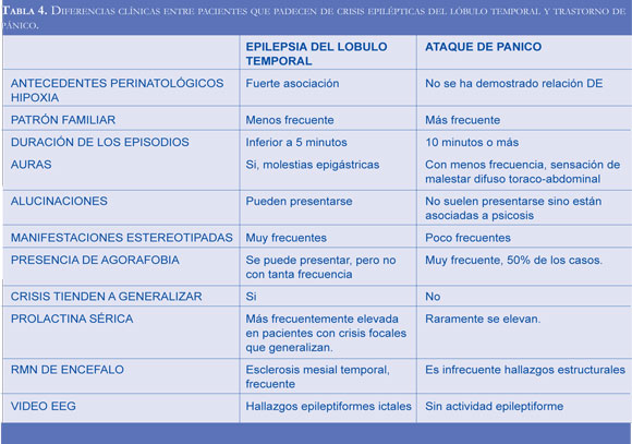 Las crisis de pánico que se presentan en la epilepsia del lóbulo temporal y los ataques de pánico son dos entidades diferentes, sin embargo, poseen manifestaciones clínicas comunes que plantean un difícil diagnóstico diferencial. Una historia clínica completa, que incluya antecedentes perinatológicos y familiares, edad de inicio de la enfermedad, manifestaciones clínicas; la realización de un EEG, una RM, incluso de videoEEG, permite diferenciar entre ellas. Cabe resaltar la importancia de realizar un diagnóstico certero debido a las complicaciones que trae el implementar medidas terapéuticas no apropiadas, en uno u otro caso.