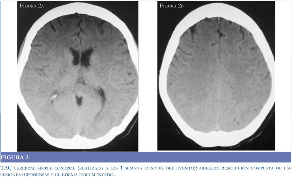 La tomografía puede no ser el método de elección en consideración a sus características operativas, pero es un recurso de fácil acceso para la aproximación diagnóstica. Si bien la tomografía puede ser negativa en la etapas tempranas del síndrome (39), está documenta la presencia de lesiones hipodensas habitualmente simétricas1 en la sustancia blanca de los territorios posteriores y gangliobasales (34) (Figuras 1 a y b); con el desenlace clínico de la patología, las imágenes tomográficas muestran una resolución de las hipodensidades descritas en el momento de mayor intensidad clínica (Figuras 2 a y b).
