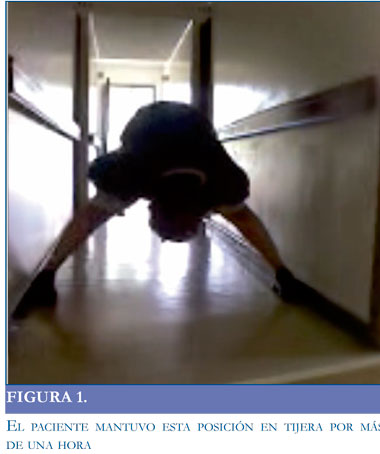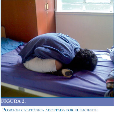 Paciente de 21 años, con antecedente de trastorno psicótico no especificado, valorado inicialmente en el servicio de urgencias psiquiátricas con cuadro de un año de insomnio de conciliación, hiporexia, ideas paranoides, alucinaciones auditivas, comportamiento extravagante, episodios de agresividad hacia los padres, se izo diagnóstico de esquizofrenia indiferenciada y se inicia manejo con clozapina 150mg/dia. Asistió nuevamente a urgencias seis meses después, por cuadro de tres meses de evolución caracterizado por insomnio global, además pérdida del cuidado personal, aislamiento social, mutismo, movimientos de balanceo del tronco, y posturas fijas (posición sentado la mayor parte del día) se reformuló diagnóstico de esquizofrenia indiferenciada por antecedentes, se inició manejo fluoxetina 20mg/día, lorazepam 1 mg/ noche, risperidona 3mg/noche. Presentó mejoría parcial de mutismo, negativismo y actitud alucinatoria y fue dado de alta. Presentó nuevamente cuadro de 10 días de evolución de síntomas similares a los de la anterior hospitalización, se modifica manejo a fluoxetina 20mg/dia, clozapina 200mg/noche, lorazepam 2mg día con pocos cambios, se planteó utilizar terapia electroconvulsiva bajo anestesia general y relajación neuromuscular (TECAR) la cual no fue autorizada por familiares, de alta sin nuevos episodios de agitación, con mejoría del patrón de sueño, alimentación y sin ideas delirantes. Continuó manejo en consulta externa durante 11 meses con dificultades en la adherencia a medicamentos y retornó al servicio de urgencias psiquiátricas, con cuadro de 20 días de reactivación de síntomas. El paciente presentaba posturas extrañas (Figuras 1 2, 3 y 4), mutismo global, mirada fija y rechazó la medicación y a los alimentos (líquidos o sólidos).