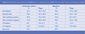 Los bajos valores de sensibilidad de los criterios del DSM IV para las pruebas de tamizaje del trastorno en el presente estudio, tanto en padres como en maestros, sugieren la existencia de alta frecuencia de falsos negativos y una pobre capacidad del cuestionario para detectar el TDAH cuando éste está presente, elementos que cuestionarían su empleo como estrategia única de investigación epidemiológica, conclusión similar a la de Grodzinsky y Barkley al examinar pruebas para evaluar, en escenarios clínicos, la función del lóbulo frontal, como el test de las tarjetas de Wisconsin, frecuentemente empleadas para el estudio del TDAH (27).