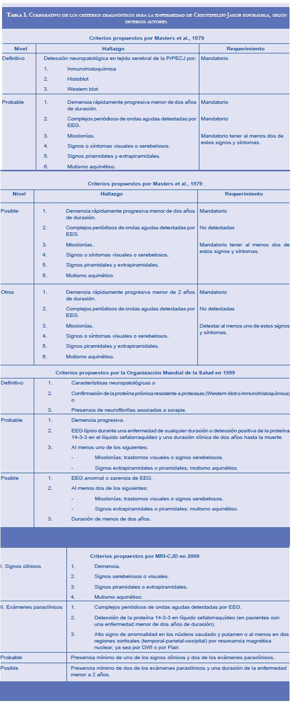 La variante panencefálica se encuentra especialmente en pacientes japoneses, notándose alteración tanto de sustancia gris como de sustancia blanca, con sintomatología tanto cortical como cerebelosa. La variante amiotrófica se caracteriza por iniciar con debilidad muscular progresiva, y en ella pueden aparecer fasciculaciones y neurodegeneración de la médula espinal. La variante atípica se observa en un 5 a 10% de los casos, puede durar más de dos años y afecta especialmente a individuos jóvenes; las mioclonías son menos frecuentes, el electroencefalograma (EEG) puede ser normal e inicia con alteración cognitiva y trastornos de comportamiento (45). Para el diagnóstico de la ECJ esporádica se han propuesto diversos parámetros, que han cambiado con el tiempo y probablemente seguirán modificándose en el futuro (ver comparativo de criterios diagnósticos en la tabla 1) (46-48). La histopatología de los casos esporádicos de ECJ reporta cambios espongiformes de corteza cerebral, ganglios basales, tálamo, corteza cerebelosa y el subiculum, además se observa pérdida neuronal, hipertrofia e hiperplasia de astrocitos y microglia, y abundantes agregados de PrP (depósitos amiloideos con diferentes patrones de agregación) (49, 50).