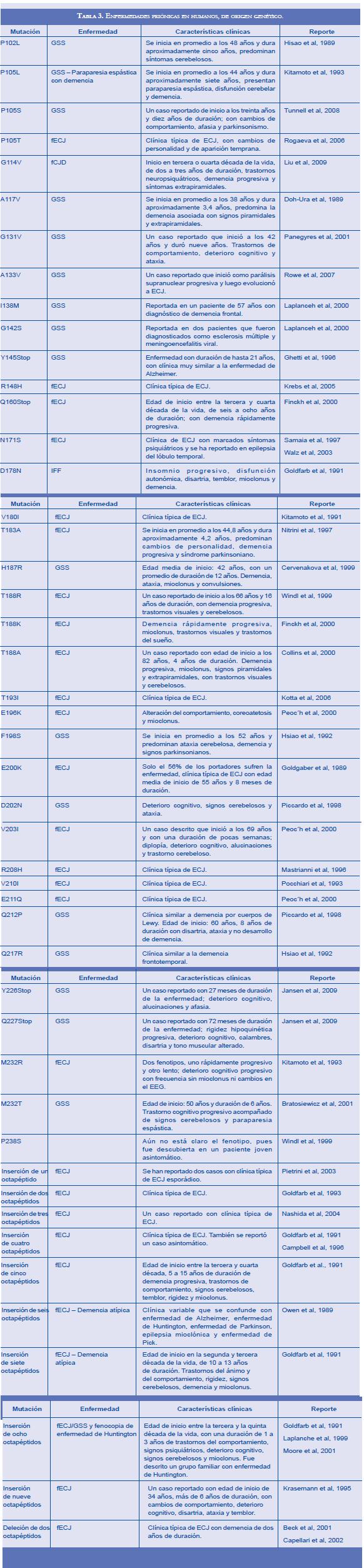 Las enfermedades producidas por agentes que cumplen los parámetros para ser llamados priones, conforman un grupo que ha aumentado progresivamente y se extiende a una amplia variedad de especies. En los humanos las enfermedades más ampliamente reconocidas como causadas por priones son las atribuidas a la proteína priónica PrP, codificada en el gen PRNP; éstas son: kuru, enfermedad de Creutzfeldt-Jakob clásica (ECJ), enfermedad de Creutzfeldt-Jakob nueva variante (nvECJ), síndrome de Gerstmann-Sträussler-Scheinker (GSS), insomnio fatal familiar (IFF), insomnio fatal esporádico (sIF), demencia atípica y paraparesia espástica con demencia. A su vez, con la ECJ pueden considerarse otras dos variantes que son la forma familiar (fECJ) y la forma infecciosa (iECJ) (10, 12).