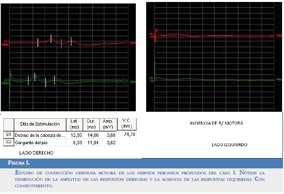 — Respuesta motora del nervio peroneo profundo derecho con latencias muy prolongadas, velocidad enlentecida y amplitud disminuida. Ausencia de respuesta en el izquierdo (Figura 1).