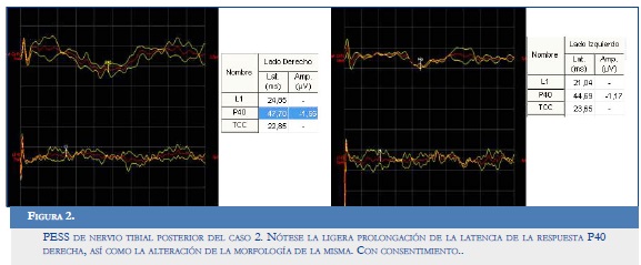 PESS de nervio tibial posterior: ligera prolongación de la latencia de la respuesta P40 derecha y del tiempo de conducción central de ese lado, lo que traduce trastorno de la conducción ligera mediada por fibras mielinizadas gruesas del sistema dorsallemniscal entre la cola de caballo y la corteza del lado derecho (Figura 2).