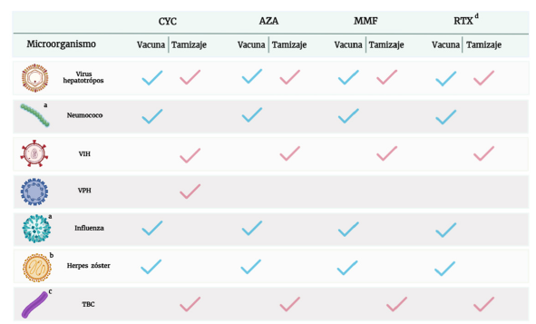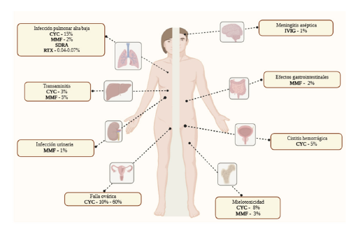 La monitorización de la administración de estos fármacos es muy importante, debido al riesgo significativo que tienen de causar reacciones adversas (tabla 6), tales como mielotoxicidad, infecciones (a excepción de IVIG) y reacciones de hipersensibilidad al momento de la aplicación (RTX e IVIG), siendo algunas de las más frecuentes y severas 24,35.