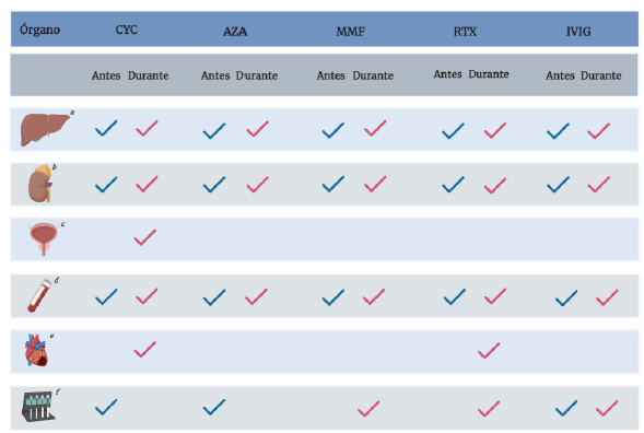 La CYC es un agente alquilante utilizado en el tratamiento de afecciones neurológicas asociadas a enfermedades como el LES, el síndrome de Sjögren, la sarcoidosis y la enfermedad de Behçet. Forma parte de esquemas terapéuticos como el NIH y el CYCLOPS, y entre sus efectos adversos se incluyen la falla ovárica, la reducción del conteo de espermatozoides, así como un mayor riesgo de cistitis y cáncer de vejiga. Por su parte, la AZA, un análogo de las purinas, se emplea en enfermedades como el lupus neuropsiquiátrico y la enfermedad de Behçet, y comparte indicaciones con el MMF. Entre los efectos adversos de la AZA, se encuentran efectos dosis-dependientes como náuseas, vómitos, anorexia e infecciones de diversa índole. Además, su uso puede inducir mielosupresión, especialmente en pacientes con ciertos tipos de mutaciones, lo que resulta en linfopenia o neutropenia, y también puede provocar hepatotoxicidad, principalmente manifestada por una elevación de la GGT.