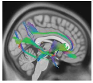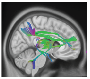 Figura 3: Vía serotoninérgica donde se muestran proyecciones de haces de sustancia blanca, a partir de segmentación de tractos en estudio por tensor de difusión (DTI), en DSI Studio en plantilla ICBM 152, presentadas en mapa de colores según convención