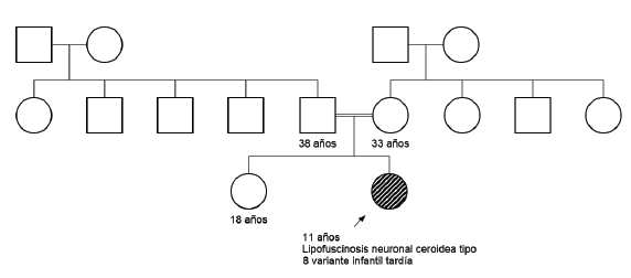 Paciente colombiana, de sexo femenino, de 11 años de edad e hija de padres consanguíneos (figura 1). Nació a las 36 semanas de gestación por cesárea, motivada por trastorno hipertensivo del embarazo y, a los 18 días de nacida, fue hospitalizada en la unidad de cuidados intensivos neonatal por sepsis neonatal de foco meníngeo.