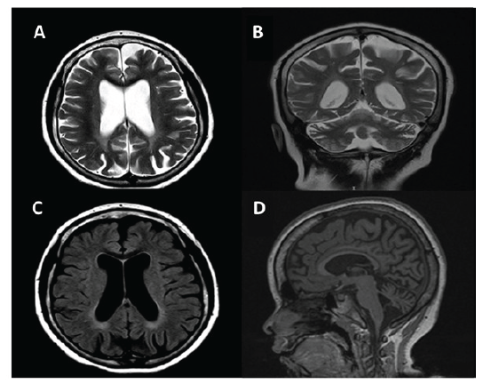 Figura 2: Imágenes de resonancia magnética cerebral (A y B: secuencia de T2 en plano axial y coronal, C: secuencia de FLAIR en plano axial y D: secuencia de T1 en plano sagital) que muestran hallazgos atróficos difusos cerebrales y cerebelosos, así como hiperintensidades en la sustancia blanca por trastorno de la mielinización retardada