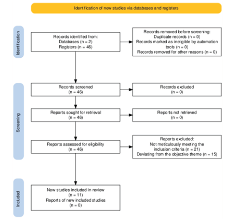 Selection process: The process consisted of three stages: identification, screening, and inclusion. Titles and abstracts were reviewed in Rayyan23, applying the inclusion and exclusion criteria. Any discrepancies were resolved by the review authors. Following the screening (n=47), 36 articles were excluded, resulting in 11 articles that met the inclusion criteria.