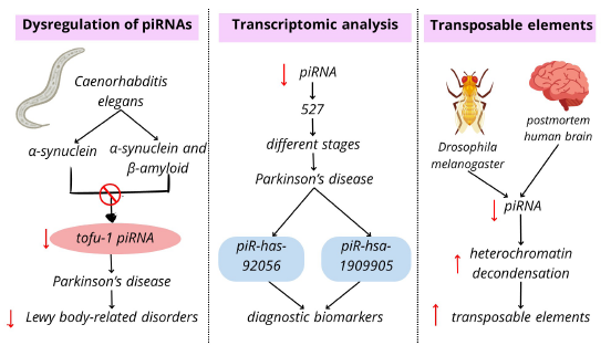 Huang et al. 1 revealed dysregulation of piRNAs in Caenorhabditis elegans models of Lewy body disease. Using transgenic strains overexpressing α-synuclein and a combination of α-synuclein and ß-amyloid, they observed that the elimination of piRNA biogenesis genes, such as tofu-1, significantly improved motor behavior in these models. These findings suggest that piRNAs may be related to the regulation of protein degradation, a crucial process in the progression of neurodegenerative diseases. Moreover, studies in human brain samples from patients with advanced Parkinson's disease showed overexpression of piRNAs, suggesting an association between piRNA dysfunction and Lewy body-related disorders and PD (Figure 2) 1,8,11.